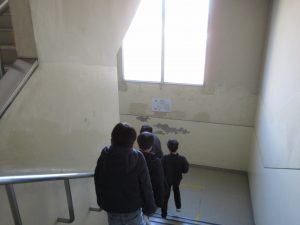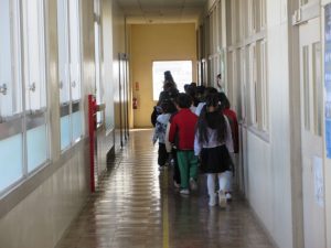 今回は「大雨により川が氾濫し、学校が浸水する」という想定のもと、校内の二次避難場所(高所)への避難を行いました。