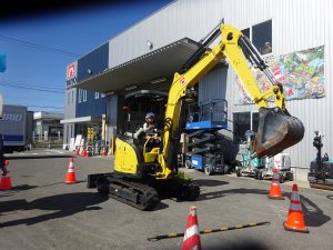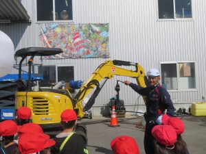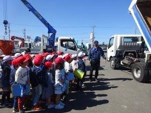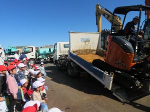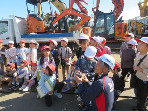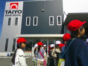 国語科の「じどう車くらべ」の学習のため、神守校区にある太陽建機レンタルさんへ行きました。