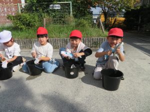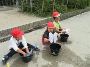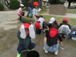 生活科「じぶんで できること 大さくせん‼」に向けて、シューズ洗いの練習をしました。