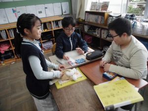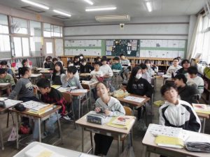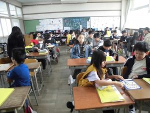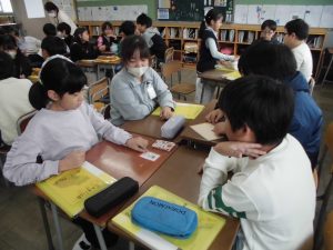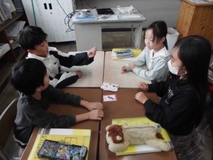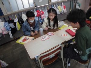 10月31日の英語の授業では、ハロウィンにちなんで英語に親しみながらハロウィンに関係する英単語を使ったカードゲームをしました。いろいろな振り付けをクラスの皆で考えて楽しくゲームに取り組む姿が見られました。どんなゲームだったかまたご家庭で話をしてみてください♪