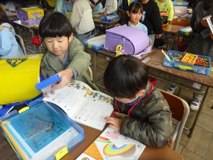 教室の椅子に座ったり、ランドセルを背負ったり、